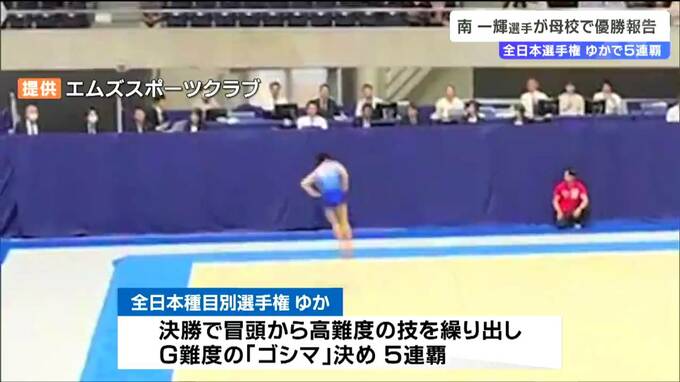 南選手は、得意のゆかの決勝で冒頭から難度の高い技を繰り出しG難度の大技「ゴシマ」も決め優勝を果たしました。