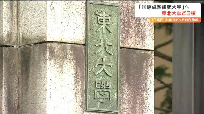 「国際卓越研究大学」東北大など3校に絞られる 認定されると授業料が免除や生活費支給を受け研究できる大学に 2023年6月28日(水) 18:20 国内 10兆円規模の大学ファンドを活用して世界トップレベルの研究力を目指す「国際卓越研究大学」について、申請した10校のうち東北大学など3校に絞られたことが分かりました。「国際卓越研究大学」とは、認定されると1…