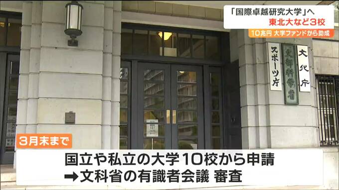10兆円規模の大学ファンドを活用して世界トップレベルの研究力を目指す「国際卓越研究大学」について、申請した10校のうち東北大学など3校に絞られたことが分かりました。