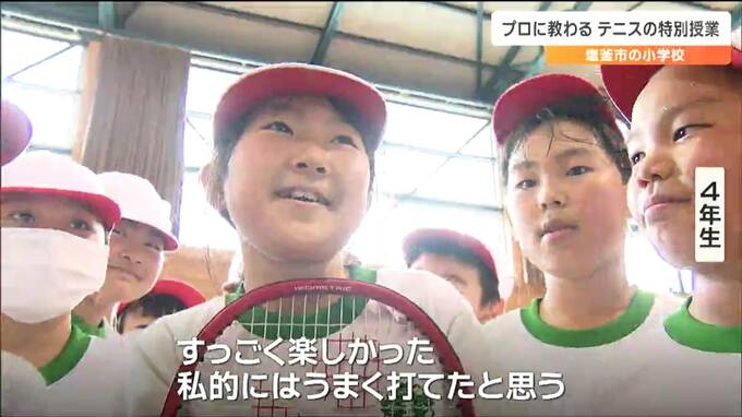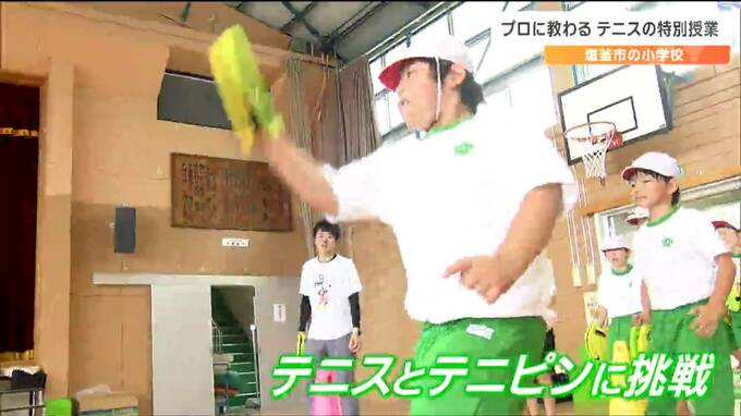 初めてのテニスに一生懸命取り組みました。宮城県塩釜市の小学校で児童たちがプロテニスプレーヤーにテニスを教わる特別授業が行われました。