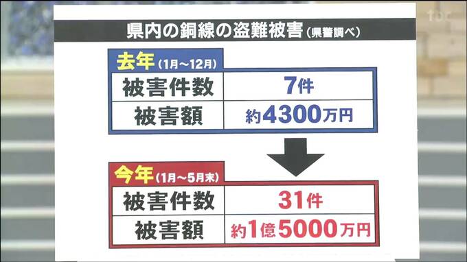 しかし、今年は1月から5月末までの5か月間ですでに31件の被害が発生し、被害額はおよそ1億5000万円に上っています。被害が急増している背景には銅の価格高騰があるということで、県警は「被害の防止には監視カメラや人感センサーの設置、機械警備システムの導入が有効」などとして、注意を呼び掛けています。