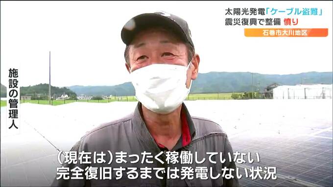 東日本大震災で被災した宮城県石巻市大川地区の中学校の跡地につくられた太陽光発電施設で、送電用ケーブルが切断され、大量に盗まれる被害がありました。震災復興を目指して整備された施設での犯行に、関係者は憤っています。