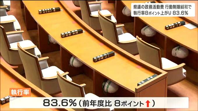 県議会事務局のまとめでは、昨年度、県議の政務活動費の交付額は2億4430万円で、そのうち2億419万円が支出されました。交付額に対する支出の割合、執行率は83.6%で、前の年度より8ポイント高くなりました。