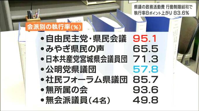 宮城県議会議員の昨年度の政務活動費は、実際に使った割合、執行率が前の年度より8ポイント高い83.6%となっています。