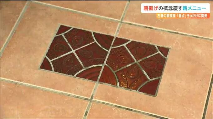 震災後、ガレキの中から見つかった流された自宅のタイル。当時のことを忘れないよう店の玄関に入れたといいます。