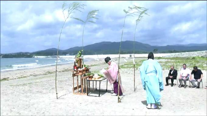 気仙沼市のお伊勢浜海水浴場で行われた安全祈願祭には、観光協会などからおよそ20人が出席し、今シーズンの安全を願いました。