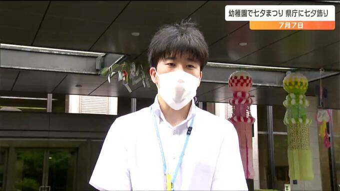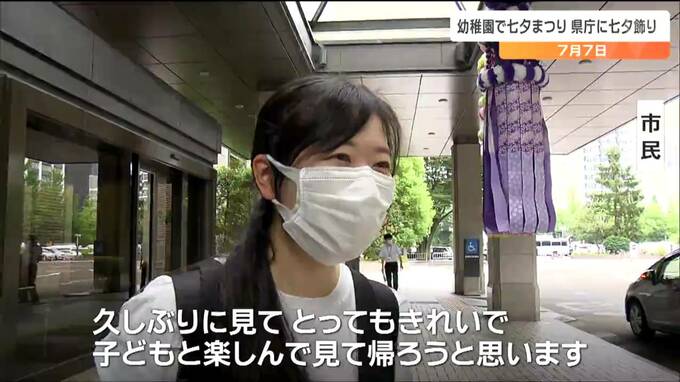 七夕飾りの設置は、仙台七夕のPRのために、県が毎年、行っているものです。7日は、色とりどりの吹き流しをつけたおよそ3メートルの七夕飾り6本が県庁の正面玄関に取り付けられました。