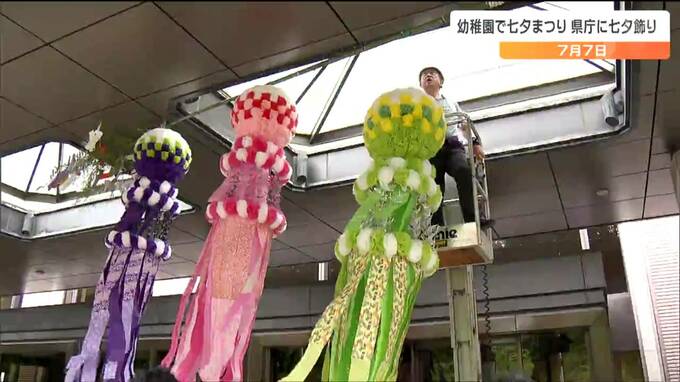 宮城県庁では、8月に開催される仙台七夕まつりを盛り上げようと、七夕飾りの設置作業が行われました。