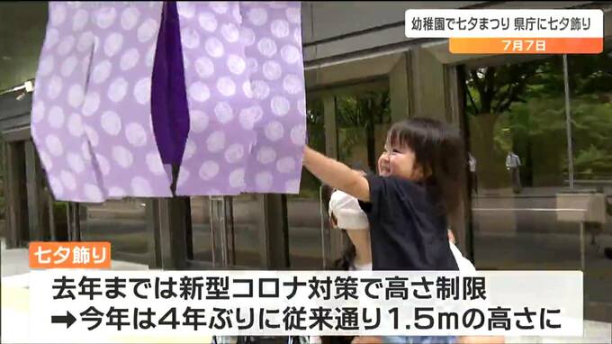 七夕飾りは、去年までは新型コロナ対策で人の手が触れないよう設置の高さを制限していましたが、今年は4年ぶりに従来どおりの地上からおよそ1.5メートルの高さに設置されています。