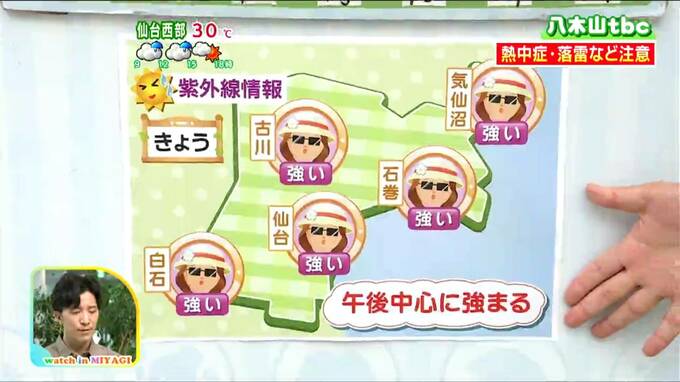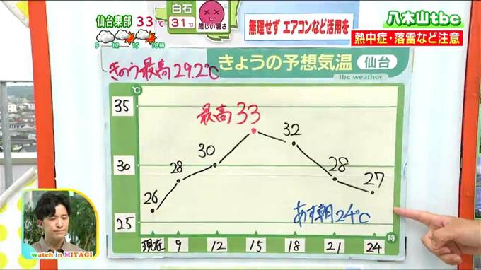 「この後晴れ間もありますが、にわか雨や雷雨のおそれも。夕方まで急な強い雨や落雷に注意してください。最高気温は広く30度以上の真夏日で、仙台は今年1番の暑さとなる予想です」