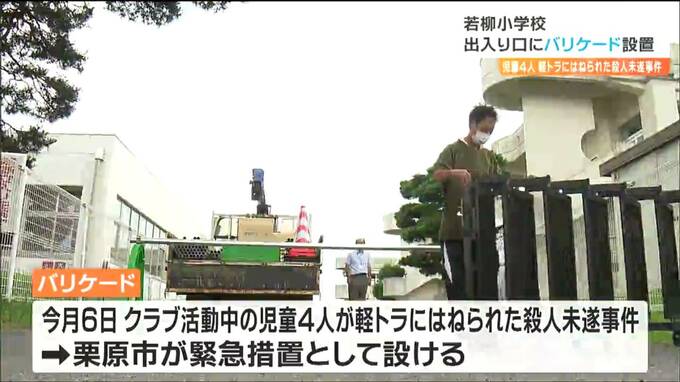 栗原市立若柳小学校では市教委や校長ら立ち合いのもと、委託を受けた業者が、出入り口にバリケードを据え置いていきました。バリケードは、今月6日、若柳小学校でクラブ活動中の児童4人が、敷地内に侵入してきた軽トラックにはねられた殺人未遂事件を受け、栗原市が緊急措置として設けました。