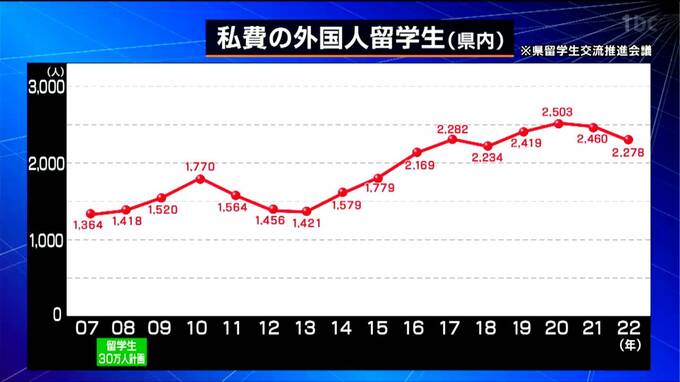 そして、こうした問題の背景にあるのが外国人留学生の増加です。県留学生交流推進会議によりますと、2022年の県内での私費の外国人留学生は2278人。2008年に国が「留学生30万人計画」を策定してから県内でも外国人留学生の人数は増えています。