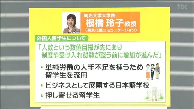異文化間コミュニケーションを専門とする明治大学の根橋玲子教授は「人数という数値目標が先にあり、制度や受け入れ態勢が整う前に増加が進んだ。単純労働の人手不足を補うために留学生が流用されたこと、それを飲み込んだ形でビジネスとして展開する日本語学校、事情を知る知らないに関わらず押し寄せる留学生という構図が見られる」と分析しています。