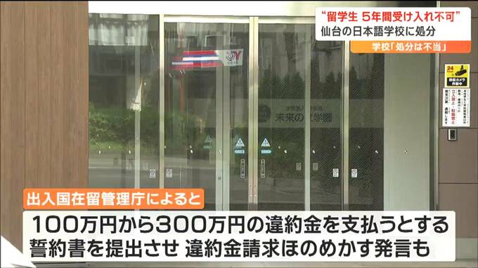処分を受けたのは、仙台市青葉区の「未来の杜学園(みらいのもりがくえん)」日本語科です。出入国在留管理庁によりますと、この学校では2017年頃から2021年7月頃まで外国人留学生に対し就労のため退学する際、およそ100万から300万円の違約金を支払うとした誓約書を提出させ、違約金請求をほのめかす発言もあったということです。実際に支払ったケースは確認されていません。