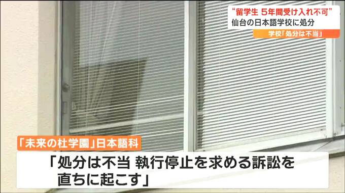 仙台市内の日本語学校が、留学生の進路の選択を妨害したとして出入国在留管理庁から5年間、留学生の受け入れができなくなる処分を受けました。学校側は、処分は不当だとして訴訟を起こす方針です。