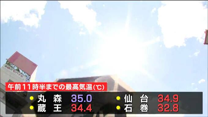 太平洋高気圧が東北地方まで張り出しているため、17日の県内は強い日差しが照り付け気温が大きく上がっています。午前11時半までの最高気温は最も高い丸森で35.0度とすでに2日連続で35度以上の猛暑日となっていて、熱中症に十分注意が必要です。消防によりますと、県内でこれまでに7人が熱中症とみられる症状で手当てを受けています。