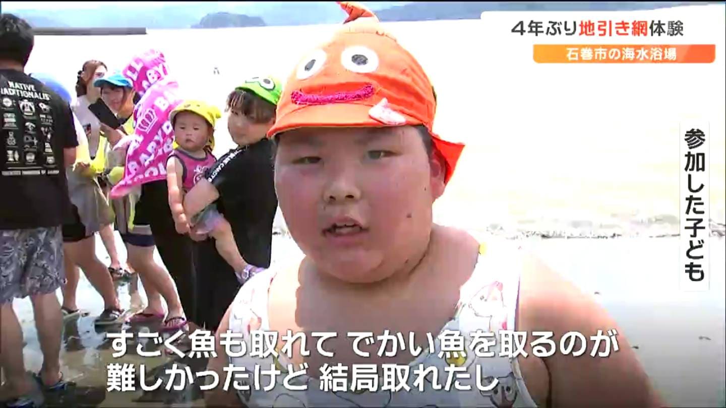 石巻市北上町の白浜海水浴場で行われた地引き網の体験には、市内の親子およそ70人が参加しました。地元の住民でつくる組合が、海に親しんでもらおうと企画したもので、新型コロナの影響から4年ぶりの開催となりました。網の長さはおよそ300メートル。力を合わせ、30分余りかけて引き揚げると、スズキやイシモチ、カレイなど200キロ以上の魚が水揚げされました。漁師も驚くほどの大漁で、獲れた魚は持ち帰ることができます。
