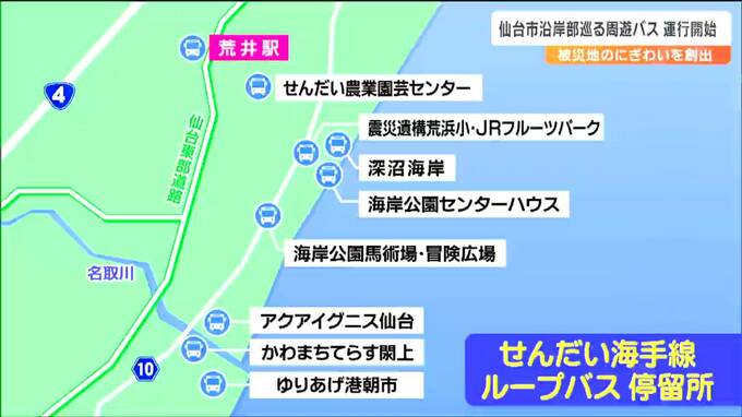 17日から運行が始まった「せんだい海手線ループバス」地下鉄東西線の荒井駅を出発し、せんだい農業園芸センター、震災遺構・荒浜小学校など沿岸地域の8つの施設に停車します。アクアイグニス仙台や名取市の「ゆりあげ港朝市」を経由し、再び荒井駅に戻る1周およそ50分のコースで、右回り・左回り合わせて1日16便運行されます。