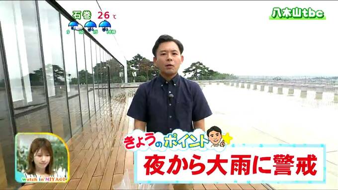 「各地で雨、夜は局地的に雷を伴い非常に激しい雨の降るおそれ」宮城の30秒天気 tbc気象台 19日 2023年7月19日(水) 10:02 国内 天気 7月19日水曜日、宮城の30秒天気です。tbc気象台、今野桂吾気象予報士がお伝えします。「きょうは各地で雨が降り、夜は局地的に雷を伴い、非常に激しい雨の降るおそれがあります。土砂災害など警戒を。買い物などは…