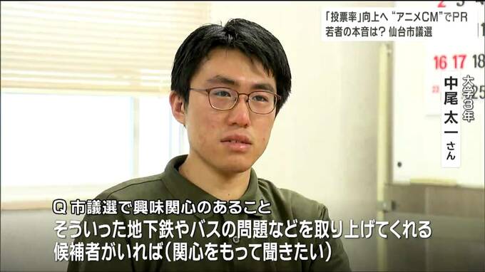 「7月に地下鉄のダイヤ改正があり、日中とか間隔が伸びた。自分は地下鉄で通学しているが、そういった地下鉄やバスの問題などを取り上げてくれる候補者がいれば、より関心をもって聞きたい」