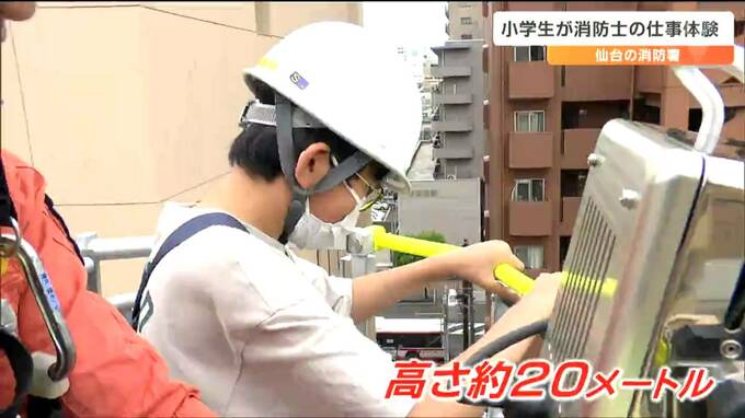 この体験会は青葉消防署が毎年、開いているもので小学生60人が参加しました。子どもたちは、まず高い所での人命救助に用いられるはしご車で、およそ20メートルの高さまで上がりました。