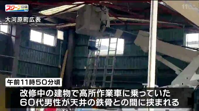 22日正午頃、宮城県大河原町の改修中の建物内で、高所作業車に乗って作業をしていた男性が屋根の鉄骨との間に挟まれて、意識不明の重体となっています。