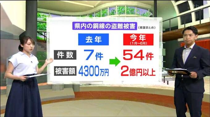 県警によりますと、去年1年間に県内で発生した銅線の盗難被害は7件、被害額はおよそ4300万円でした。しかし、今年は1月から6月末までの半年間で少なくとも54件の被害が発生し、被害額は2億円以上に上ります。