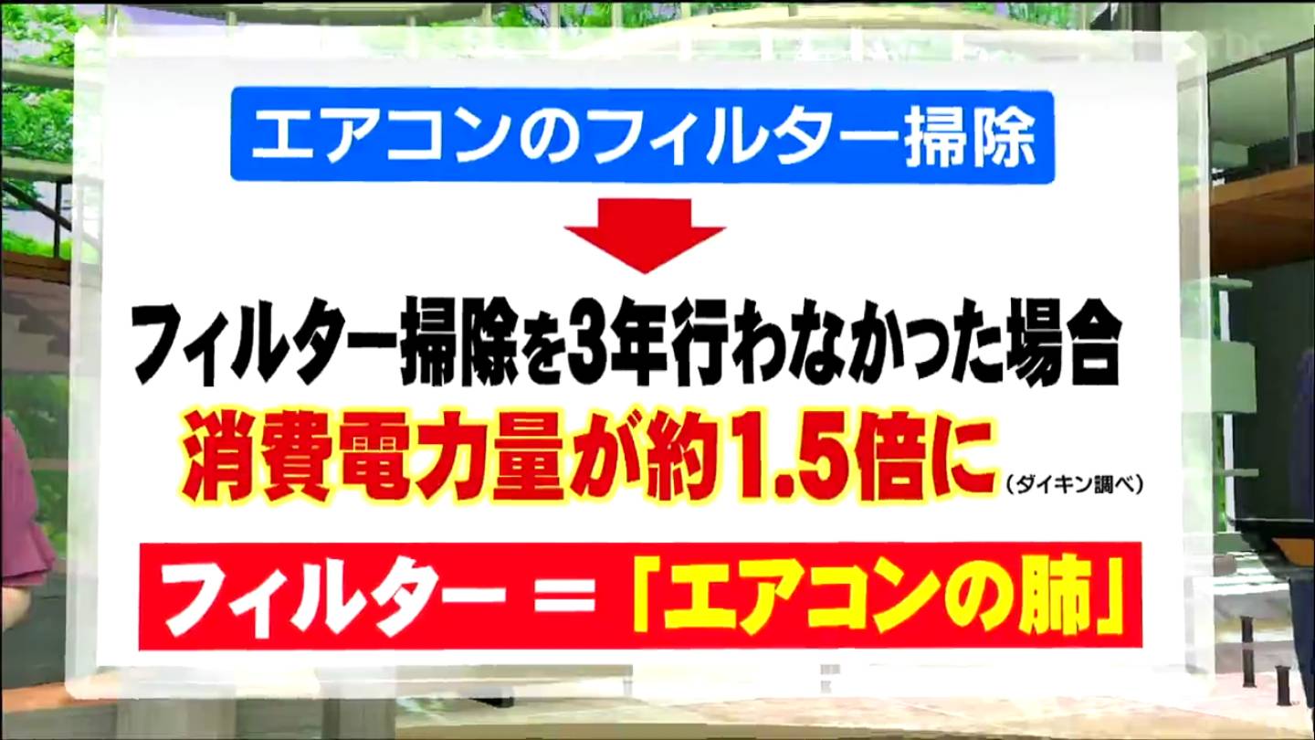 フィルターの交換を3年行わないでいると消費電力量がおよそ1.5倍に上がるということです。フィルターはいわば「エアコンの肺」のようなものですのでこまめに掃除をしてほしいと話していました。