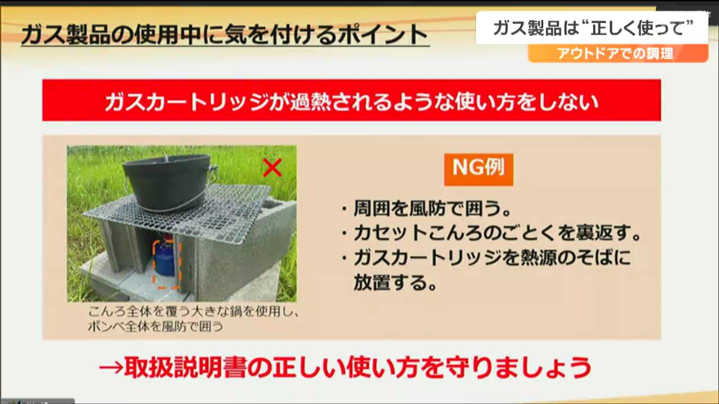 夏休み中のキャンプやバーベキューなど、楽しいアウトドアもガス製品を誤って使うと事故に繋がる恐れがあります。ガス製品などの事故調査を行う独立行政法人ではアウトドアでの調理について注意を呼びかけています。
