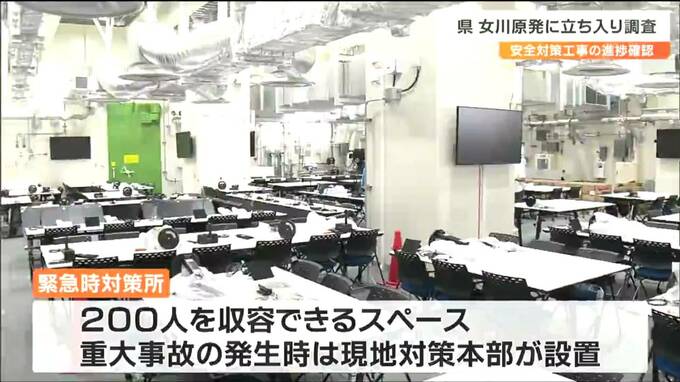立ち入り調査には県や女川町、石巻市の職員ら18人が参加しました。職員らは海抜60メートルの高台に建設されている「緊急時対策所」を視察し、災害が起こった場合の対応について、東北電力の担当者から聞き取りを行いました。