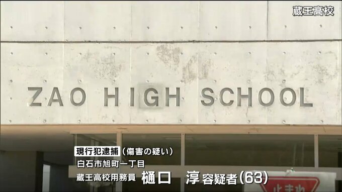 傷害の疑いで現行犯逮捕されたのは、蔵王高校の用務員で白石市旭町1丁目に住む樋口淳容疑者(63)です。