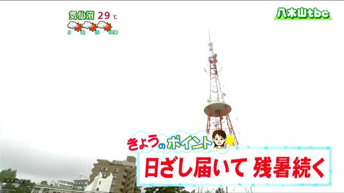 「日中は晴れ間が広がり残暑厳しく夜は所々でにわか雨も」宮城の30秒天気 tbc気象台 11日 2023年9月11日(月) 11:12 国内 天気 9月11日月曜日、宮城の30秒天気です。tbc気象台、今野桂吾気象予報士がお伝えします。「日中は晴れ間が広がるものの、夜は曇り空に変わり所々でにわか雨もあるでしょう。最高気温は各地で30度以上と厳しい蒸し暑さ…