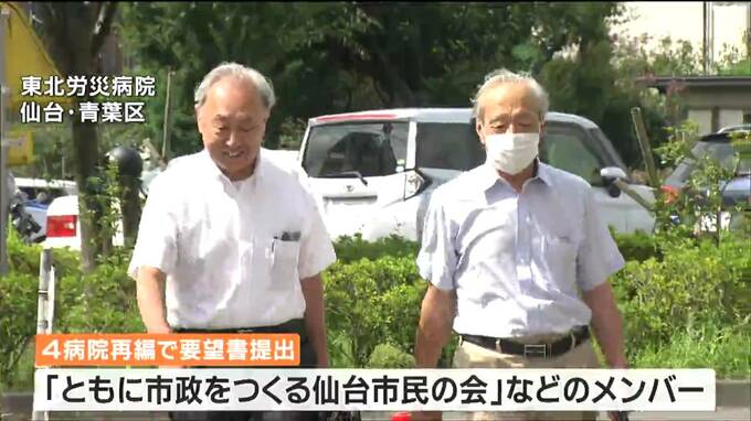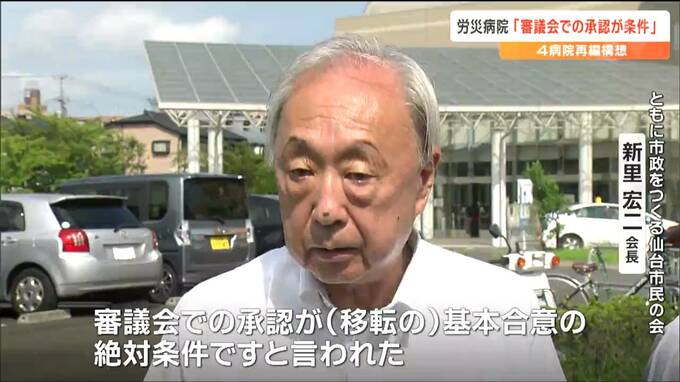 宮城県が構想する仙台医療圏の4病院再編について、市民団体が14日、病院の統合・移転の撤廃を求める要望書を青葉区の東北労災病院に提出しました。市民団体は、病院から、移転には今紛糾している県の審議会での承認が条件と伝えられたと話していますが、村井知事は、労災病院を運営する機構の理事長に確認し「審議会の承認と基本合意は無関係」との認識で一致したと主張しています。