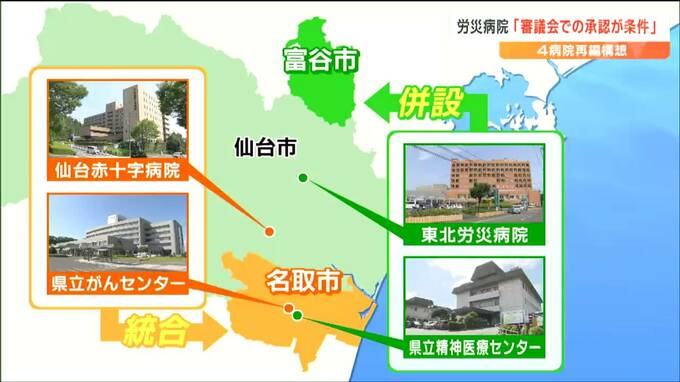 県の4病院再編構想は、名取市にある県立精神医療センターと東北労災病院を併設して富谷市に。太白区の仙台赤十字病院と県立がんセンターを統合して名取市に移転させる計画です。