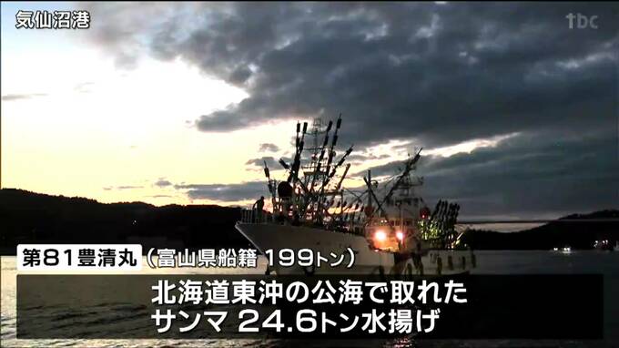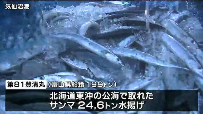 気仙沼港に入港したのは、富山県船籍の第81豊清丸199トンで、北海道東沖の公海で取れたサンマおよそ24.6トンが水揚げされました。