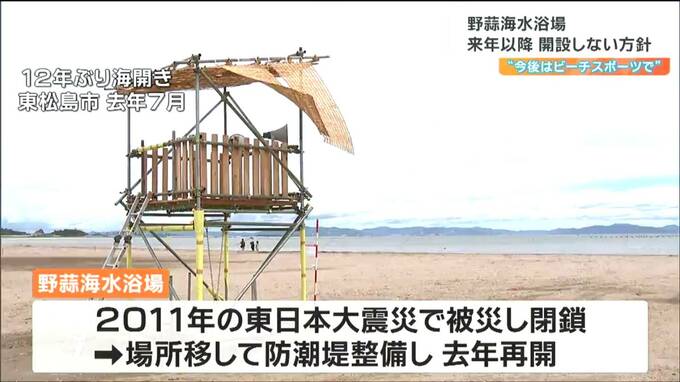 このため市は、来年以降、野蒜海水浴場を開設しない方針を固めました。野蒜海水浴場には、ビーチスポーツ用のコートが8面整備されていて、市は今後、全国規模の大会を誘致するなどして活用することにしています。