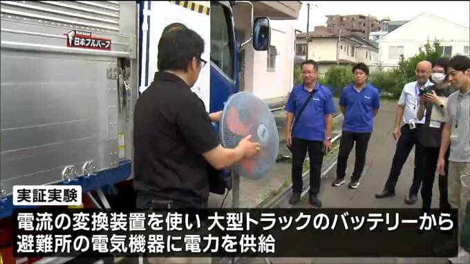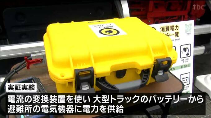 の実証実験は電流の変換装置を使い、大型トラックのバッテリーから避難所の電気機器に電力を供給するものです。