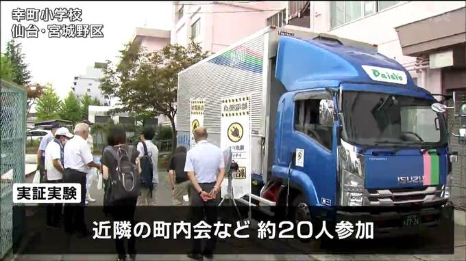 災害時、トラックのバッテリーを使って避難所の電気機器に電力を供給するための実証実験が16日仙台市内の小学校で行われました。