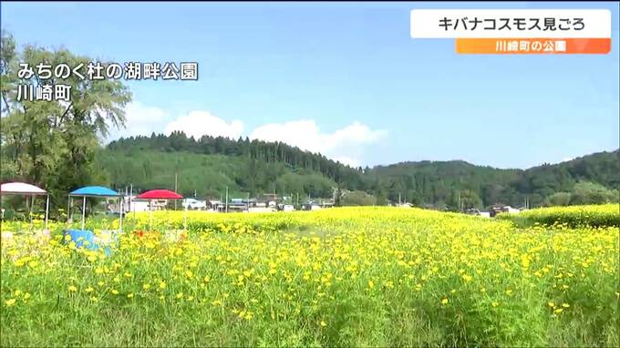 宮城県川崎町の公園ではキバナコスモスが見頃を迎え、辺り一面に咲く黄色い花が訪れた人たちの目を楽しませています。