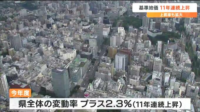 県地価調査は、7月1日時点の県内405地点の価格を調査したもので、土地取引の目安となります。今年度の県全体の平均変動率はプラス2.3%で、11年連続の上昇となりました。上昇率は去年を0.6ポイント上回っていて、全体的には新型コロナの影響が和らぎ、地価の回復傾向が見られました。