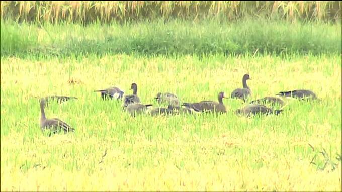 21日午前9時40分頃、県伊豆沼・内沼環境保全財団の研究員が、伊豆沼の南側の稲刈りが終わった田んぼで羽根を休めている50羽の群れを確認しました。伊豆沼周辺で、マガンの飛来が確認されたのは今シーズン初めてで、平年より1日遅く、去年より4日遅い第一陣となりました。