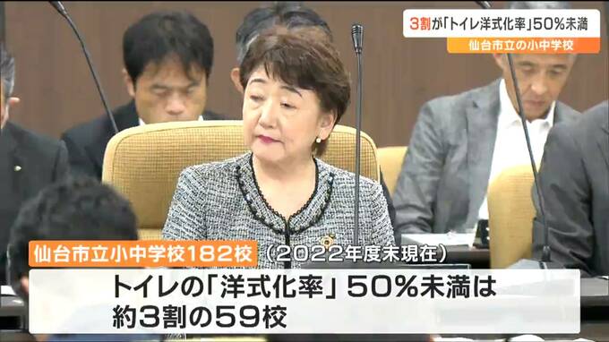 仙台市立の小中学校182校のうちトイレの「洋式化率」が50%に達していない学校は2022年度末現在で、全体の3割にあたる59校に上るということです。内訳は青葉区が12校、宮城野区が12校若林区が7校、太白区が17校、泉区が11校となっています。
