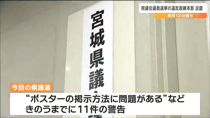 県議会議員選挙の選挙違反取締本部は、県警捜査二課に設置され、入口に看板が掲げられました。県警によりますと、前回2019年の県議会議員選挙では30件の警告が出されました。今回の県議選でもポスターの掲示方法などに問題があるなど、21日までに、すでに11件の警告が出されているということです。