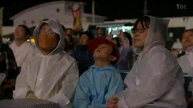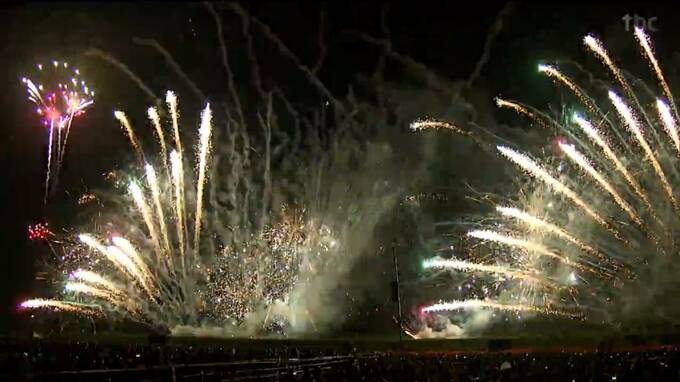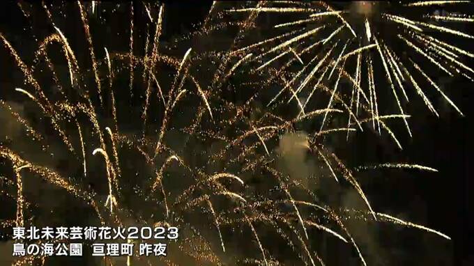 会場となった亘理町荒浜の鳥の海公園では音楽のリズムや歌詞に合わせて色とりどりの花火が打ち上げられました。