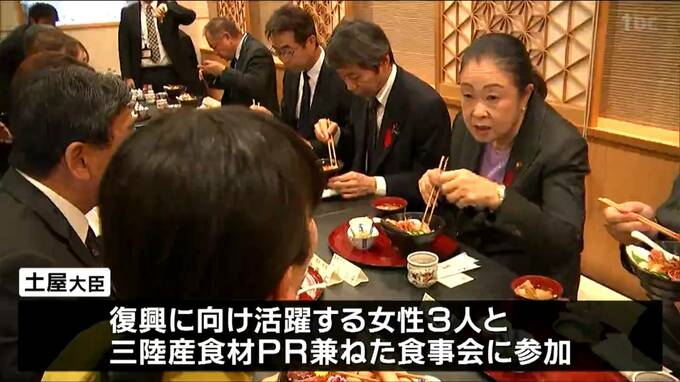 土屋復興大臣は4日、石巻市を視察したあと南三陸さんさん商店街を訪れました。土谷復興大臣は、農業、観光業、地域福祉の分野で復興に向け活躍する女性3人と三陸産食材のPRを兼ねた食事会に参加しました。女性たちに向けて「これからも三陸産食材を応援したい」と話したということです。