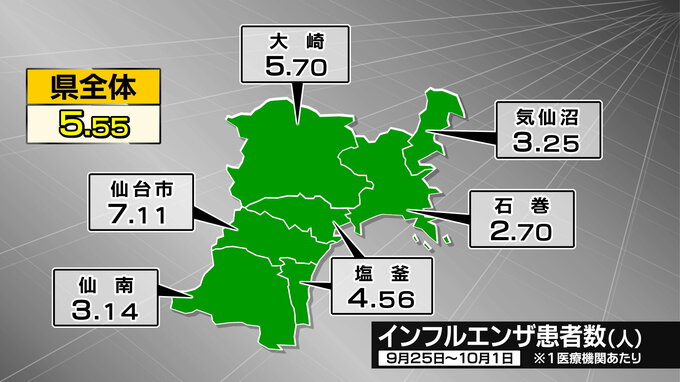今月1日までの1週間に県内の定点医療機関でインフルエンザと診断された人の数は、1医療機関あたりの平均で前の週より0.02人多い5.55人と、ほぼ横ばいでした。保健所別では、仙台が7.11人と最も多く、塩釜で4.56人、大崎で5.7人などとなっています。