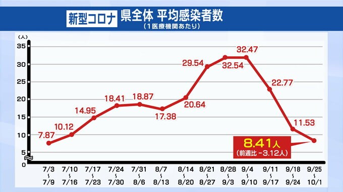一方、新型コロナの感染者数も1医療機関あたりの平均で前の週より3.12人少ない8.41人と4週連続の減少です。