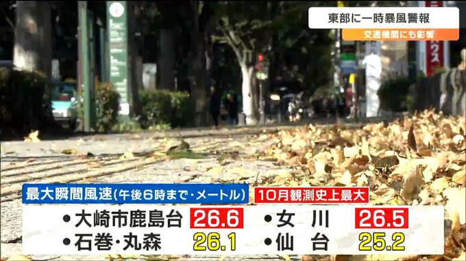 最大瞬間風速「大崎市鹿島台で26.6メートル、女川で26.5メートル」2か所で10月の観測史上最大 一時暴風警報 交通機関にも影響 宮城 2023年10月6日(金) 17:49 国内 冬型の気圧配置が強まり、宮城県内は東部を中心に西寄りの風が強く吹き、一時、暴風警報が発表されました。10月として観測史上最も風が強まった所もあり、交通機関にも影響が出ました。県内は、西高東低の気圧配置…