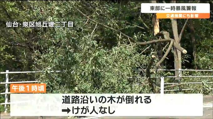 この風の影響で、午後1時頃、仙台市泉区旭丘堤2丁目では、道路沿いの木が倒れて道を塞ぎました。けがをした人はいませんでした。消防などによりますと県内では午後5時現在倒木などの被害の通報が、およそ25件ありました。