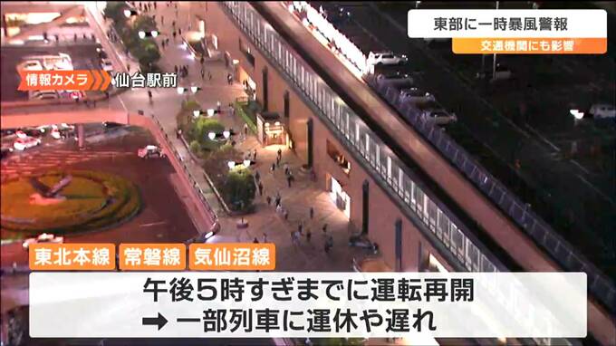 JR東日本によりますと、強風の影響により一部区間で運転を見合わせていた東北本線、常磐線、気仙沼線は午後5時すぎまでに全て運転を再開しましたが一部の列車に運休や遅れが出ています。